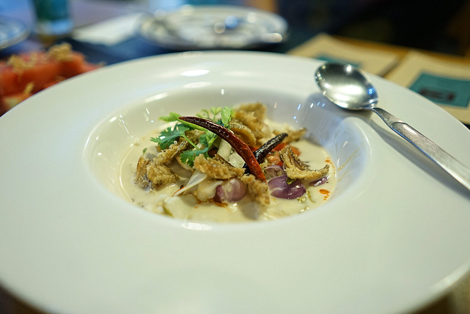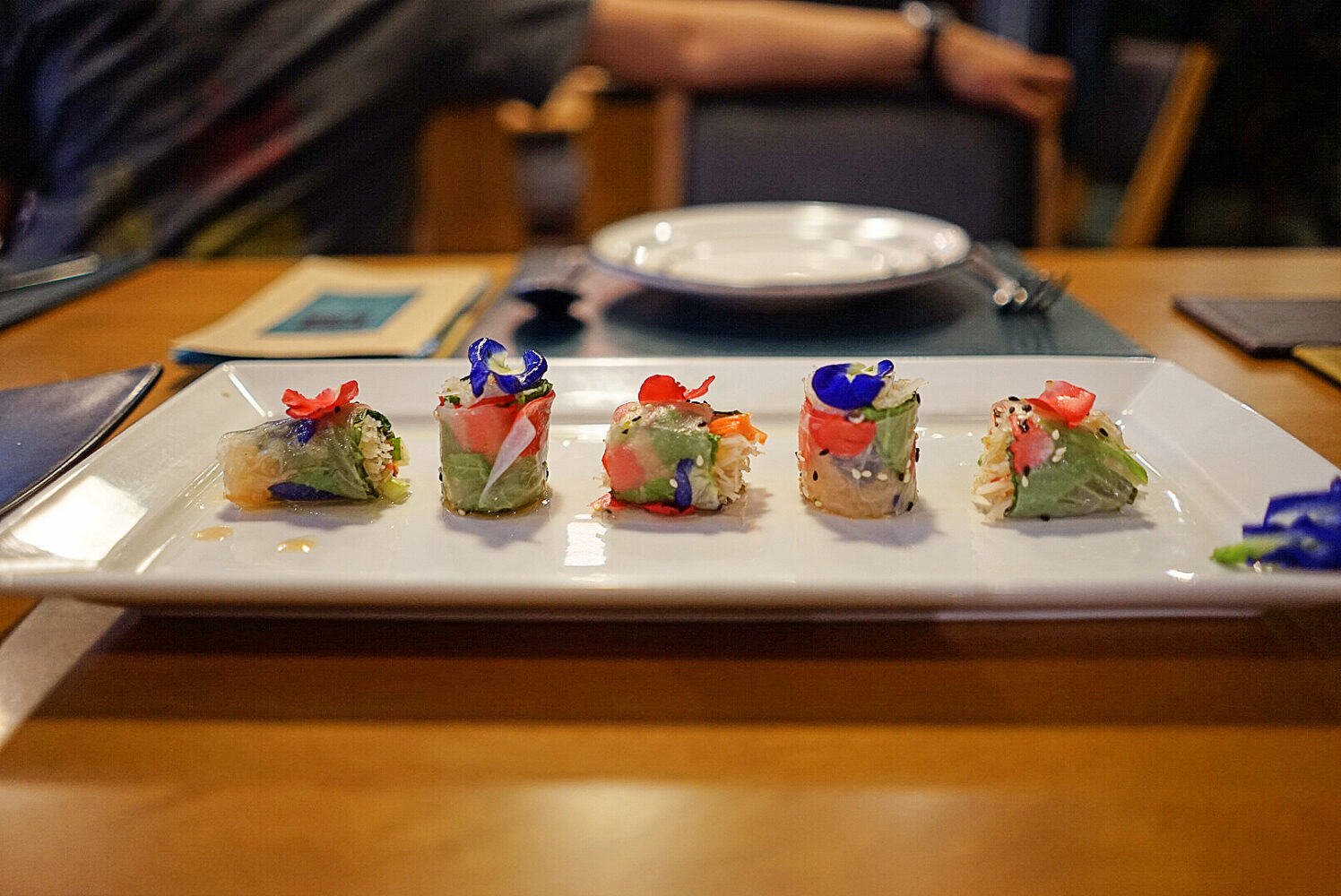 พัดเริ่มจากสั่ง “ปลาแห้งแตงโม” อันนี้ไม่เคยเห็นที่ไหนมาก่อนเลย เป็นแตงโมหั่นมาเป็นแท่ง ๆ แล้วโรยด้วยปลาแห้งที่เหมือนกับปลาแห้งที่เราทานกับข้าวเหนียวมูนค่ะ จานนี้ทานแล้วสดชื่นจริง ๆ ค่ะ ต่อด้วย “ห่มรัก ในสวน” เป็นคล้าย ๆ กับก๋วยเตี๋ยวลุยสวนแต่ไม่มีเนื้อสัตว์เลยนะคะ จานนี้สวยมาก ๆ จนไม่อยากทานเลยค่ะ ไส้ข้างในมีดอกไม้ด้วยนะ