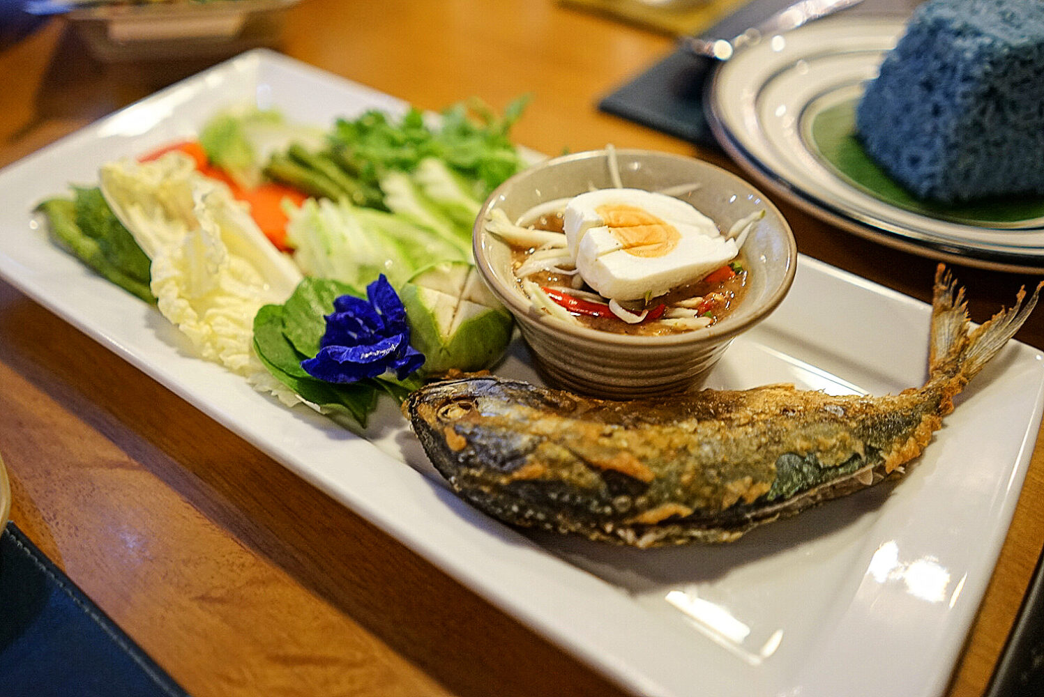 พัดสั่งอาหารเยอะมาก ๆ ค่ะเพราะว่าหิวมากแล้วก็มากันหลายคน มีทั้งต้มข่าปลาสลิด (จานนี้รสจัดจ้านถึงใจมาก ๆ) เป็ดย่างผักบุ้งกรอบ(พัดชอบจานนี้มากค่ะ) พะโล้กุ้งกรอบ น้ำพริกกะปิปลาทูทอด กะหล่ำปลีผัดน้ำปลา แกงเขียวหวานหมูย่างลำไย โอ้ยอร่อยไปหมด และข้าวสวยที่ร้านนี้เค้าจะเป็นข้าวสีฟ้าค่ะ เป็นสีจากดอกอัญชัญค่ะ