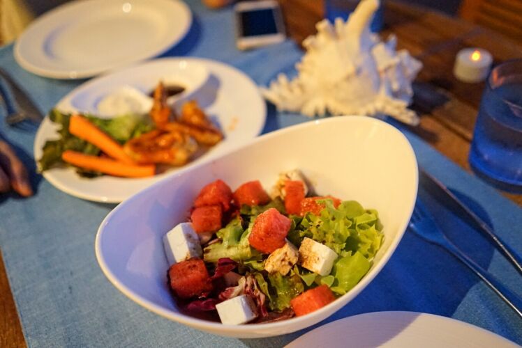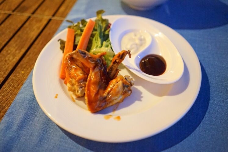 พอถึงดินเนอร์พัดเลยขอใช้สิทธิ์ใน package ที่ได้มาคือ free dinner ที่ “Azure Bar and Grill” ค่ะ บรรยากาศก็น่ารักดีสบาย ๆ เป็นกันเอง แต่สำหรับอาหารที่มาใน Package เค้าก็จะมีเมนูพิเศษเป็น set menu สำหรับแขกที่ซื้อ Package นี้โดยเฉพาะ มีอาหารให้เลือก 3 คอร์ส เป็น appetizer, main dish, แล้วก็ของหวาน แต่ละคอร์สก็จะมีอาหารให้เลือก 2-3 อย่างค่ะ พัดสั่ง appetizer เป็น Greek salad, Chicken wings ส่วน Main เป็น Margarita pizza สำหรับ 2 คน และของหวานเป็น Coconut Pannacotta แต่ของหวานอีกอย่างจำไม่ได้ว่าคืออะไร ทั้งหมดนี้คือที่สุดของการเสียความรู้สึกกับโรงแรมนี้เลยค่ะ อาหารไม่อร่อยเลยยยยยยย ขอย้ำ! รสชาติแค่พอทานได้ (ทานไม่หมดด้วย) คือถ้าpackageจะรวมดินเนอร์แล้วให้อาหารแบบนี้อย่าให้เลยดีกว่าในความรู้สึกพัดนะ คือให้เหมือนไม่อยากจะให้ choice ที่ให้เลือกคืออาหารไม่น่าทานแล้วคือดูออกว่าเลือกแบบคุม cost ให้ราคาถูกที่สุด ไม่มีเลยหรือเปลี่ยนเป็น champagne 1 ขวดหรือสปาฟรี 1 ชั่วโมงแบบโรงแรมอื่นจะรู้สึกดีกว่านี้มากค่ะ