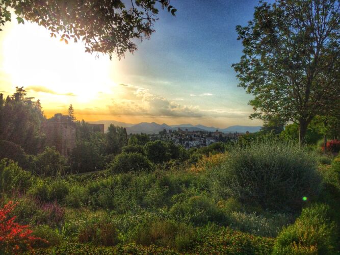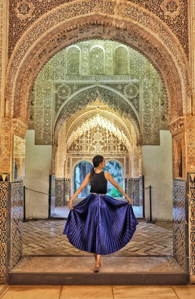 ที่ “Alhambra” มีความสวยงามแปลกตาก็เนื่องจากว่าเป็นสถาปัตยกรรมของชาวมัวร์เพราะสร้างในยุคที่กษัตริย์มุสลิมชาวมัวร์มาปกครองสเปนค่ะ นอกจากสถาปัตยกรรมแบบมัวร์แล้วที่วังแห่งนี้ก็ยังมีหลายส่วน ซึ่งบางอาคารนั้นไม่ได้เป็นสถาปัตยกรรมแบบเดียวกันนะคะเนื่องจากว่าได้ถูกยึดครองโดยคริสเตียนจึงมีการนำสถาปัตยกรรมแบบอื่น ๆ เข้ามาด้วย เช่น Palace de Carlos V ที่เป็นสถาปัตยกรรมแบบ Renaissance ค่ะ และเนื่องจากพระราชวัง Alhambra ตั้งอยู่บนเนินเขาสูงจึงทำให้มองเห็นวิวเมืองและทุ่งนาโดยรอบบรรยากาศดีมาก ๆ ค่ะ ช่วงที่พัดไปอากาศกำลังดีเย็นสบายสุด ๆ