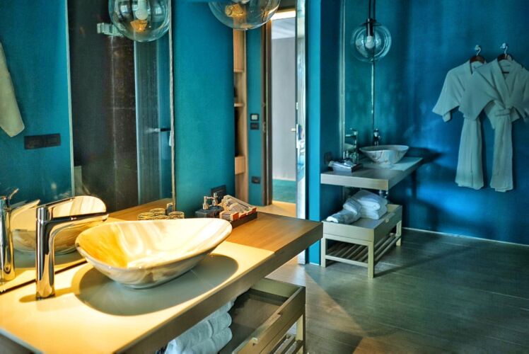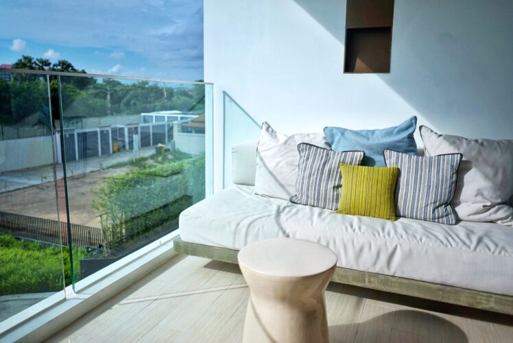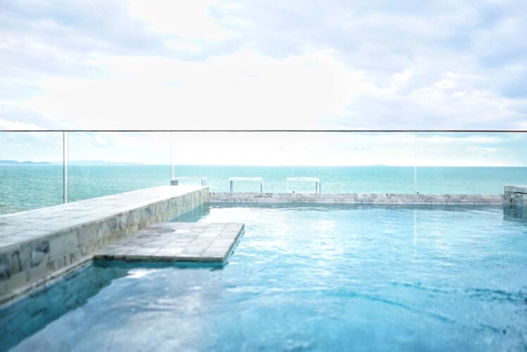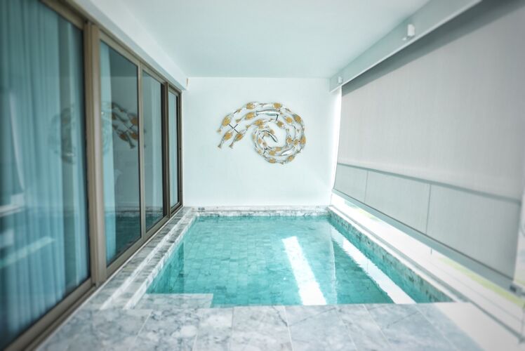 ส่วน Sky Pool Villa นี่บอกเลยว่าดีงามม๊ากกกก  ห้องนี้จะอยู่ชั้นบนของโรงแรมค่ะ  พอเปิดประตูเข้าห้องมาก็จะเห็นวิวทะเลจากมุมสูง และห้องนี้ยังมีความพิเศษที่เป็นห้องแบบ Duplex คือมี 2 ชั้นพอเราเข้ามาก็จะต้องเดินลงบันไดเพื่อไปยังห้องนั่งเล่นและสระว่ายน้ำของห้องที่อยู่ชั้นล่างค่ะ  Sky Pool Villa มี 2 ห้องนอนนะคะ อยู่ชั้นบน 1 ห้องและชั้นล่างอีก 1 ห้อง  นอกจากห้องจะสวยแล้วยังวิวดีมาก ๆ ค่ะ  เหมาะมาสังสรรค์กับเพื่อน ๆ มากกกกกกก