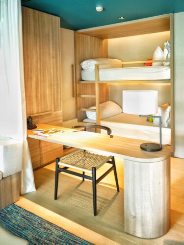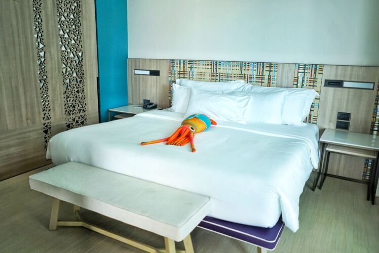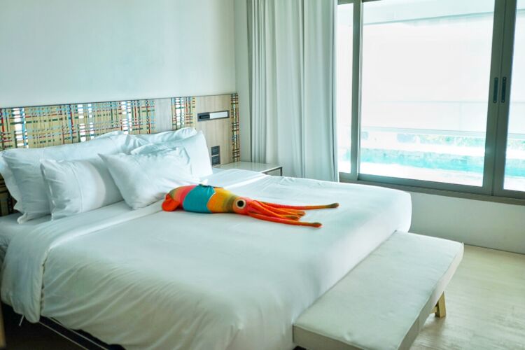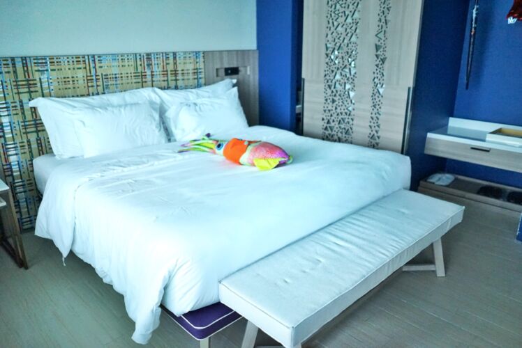 พัดขอเริ่มจาก Family Pool Suite นะคะ  พัดว่าเป็นห้องที่เหมาะกับการมากับครอบครัวมาก ๆ (จริง ๆ มากับเพื่อน ๆ ก็ดีงามเช่นกัน) ห้องนี้สามารถนอนได้ 4-5 คนนะคะ จะมีห้องนอนใหญ่ที่เป็นเตียง king size ขนาดพิเศษ 8 ฟุตใหญ่ไปอี๊กกกก แล้วในส่วนของห้องนั่งเล่นจะมีเตียง 2 ชั้น  ซึ่งสามารถปิดม่านโซนนี้เพื่อเพิ่มความเป็นส่วนตัวได้ด้วยค่ะ  เด็ก ๆ ต้องชอบมากแน่ ๆ