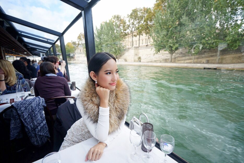 อีกกิจกรรมที่น่าสนใจเมื่อมาปารีสก็คือล่องเรือชมวิวทานอาหารกลางวันค่ะ ใน Package ก็จะรวมทุกอย่างตั้งแต่รถมารับ-ส่งที่โรงแรม-ท่าเรือตอน 11.30 พอขึ้นเรือแล้วก็จะมีอาหารมาเสิร์ฟค่ะมีทั้งหมด 3 คอร์ส จานแรกเป็น appetizer รวม 4 อย่างมาเป็น portion เล็ก ๆ ต่อมาจานหลักเป็นไก่ แล้วก็ของหวานมาเป็นจานแล้วมีขนม 4 อย่างเหมือนกับ appetizer ค่ะ สำหรับเครื่องดื่มมีแต่น้ำเปล่าให้นะคะใครอยากส่ังไวน์ ชา กาแฟก็สามารถสั่งได้แต่ไม่รวมอยู่ใน package ต้องจ่ายเพิ่มค่ะ