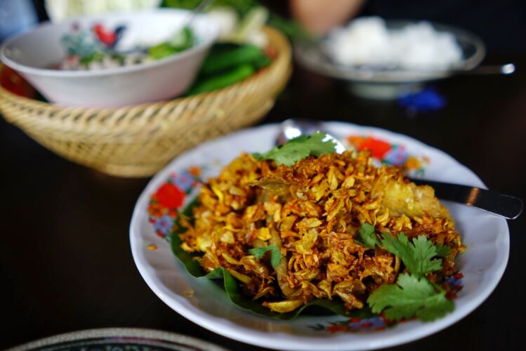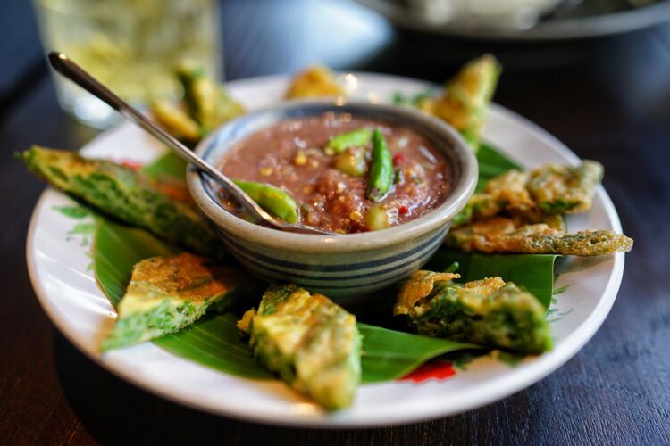 มาเริ่มที่อาหารกันเลยดีกว่าบอกเลยว่าเด็ด  จริง ๆ พัดมาร้านนี้หลายรอบแล้วค่ะสั่งมาก็หลายเมนูเอาเป็นว่าวันนี้พัดจะมาบอกว่าอะไรที่พัดชอบมากจริง ๆ แล้วจานไหนที่พัดว่าเฉย ๆ ละกันนะ  สำหรับอาหารทานเล่นที่พัดสั่งมาแล้วโดนใจก็คือ  “ปลาเห็ดโคนทอดขมิ้น” ปลากรุบกรอบมาก กระเทียมที่โรยมาคือดีเรียกว่าปลาหมดแล้วห้ามเก็บจานขอทานกระเทียมต่อ  ต่อมาเป็น “พล่าปลาน้ำดอกไม้”  ตอนแรกพัดนึกว่าเป็นยำค่ะแต่ไม่ใช่มันจะเป็นเนื้อปลาสะดุ้งน้ำส้มสายชูวางมาบนผักฝอย  ที่เด็ดคือน้ำจิ้มที่แยกมาค่ะ  เป็นคล้าย ๆ น้ำจิ้มซีฟู้ดแต่ผสมถั่วมาด้วย เหมือนเป็นถั่วแปบอะไรแบบนั้นมีความหวานของน้ำตาลที่เคลือบถั่ว ลงตัวมากกกกอร่อยมาก ๆ ค่ะ  และอีกจานที่หน้าตาดูธรรมดาแต่รสชาติดีทีเดียวก็ คือ “ปลาหมึกแดดเดียว” ทอดมากำลังดีมากค่ะไม่เหนียว  แล้วก็ “มีน้ำพริกกะปิไข่เจียวชะอม” แบบเป็นอาหารทานเล่น  หรือจะสั่งชุดใหญเป็นกับข้าว “น้ำพริกกะปิปลาทูทอด” ก็ได้จะมากับปลาทูและเครื่องเคียงครบเซ็ตค่ะแต่วันนี้พัดสั่งแบบเล็กมีแค่ไข่เจียวชะอม  จริง ๆ ที่ร้านเค้าแนะนำ “หมูสับปลาเค็มตราด” มาก ๆ พัดว่าก็อร่อยดีแต่ยังไม่สุดมีร้านอื่นที่อร่อยกว่าค่ะ