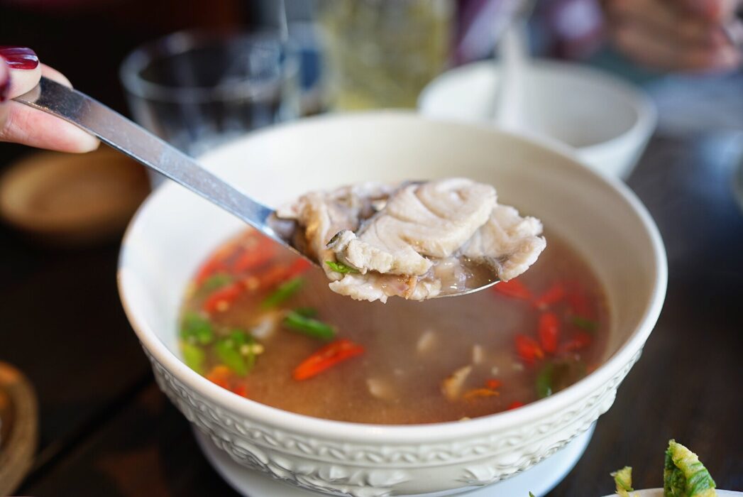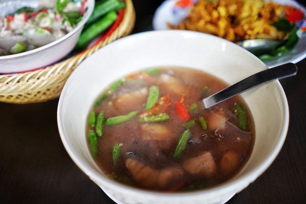 ต่อมาเป็นกับข้าวกันบ้างมี 2 จานที่เลิฟม๊ากกกกก คือไปอีกก็สั่งอีก สั่งมันทุกรอบก็คือ “หลนปลาเค็ม” กับ “ปลากระพงต้มส้มระกำ” อร่อยเว่อร์ไม่อยากบรรยายมากอยากให้ไปชิมกันเองค่ะ  “มัสหมั่นไก่ทุเรียน” ก็ใช้ได้เลย แล้วก็มี “แกงหมูชะมวง” ที่เป็นจานที่ร้านแนะนำแต่ไม่ค่อยถูกจริตพัดเท่าไหร่เนื่องจากเป็นคนไม่ชอบทานแกงหมูชะมวงเลย  แล้วก็สั่ง “วุ้นเส้นผัดชะอม” ด้วยอันนี้รู้สึกว่าธรรมดา
