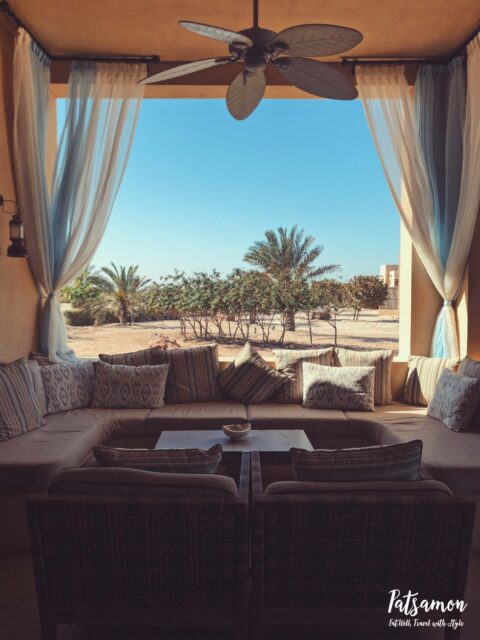 คืนแรกพัดอยากมาพักผ่อนชิลล์ ๆ ไม่ต้องทำอะไรมากเพราะเหนื่อยจากการเดินทางพัดเลยเลือกนอนที่วิลล่าริมทะเลก่อนค่ะ ที่ Al Yamm Resort มี beachfront villa 2 แบบคือแบบริมหาดทรายและแบบริมชายหาดป่าโกงกาง พัดชอบหาดทรายมากกว่าเลยเลือกพักแบบนี้ค่ะ วิลล่าเค้าจะอยู่บนหาดเลยค่ะ ด้านในห้องพักเค้าก็จะสีสันสดใส เปิดประตูออกมาก็เจอทะเลเลย มีระเบียงให้นั่งเล่นชมวิวด้วยค่ะ