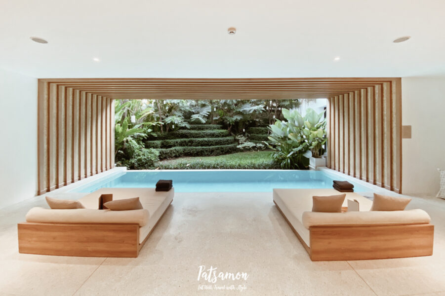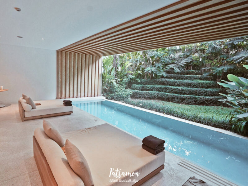 พอเราเดินผ่านทางเข้าที่เป็นซุ้มต้นไม้ลงมาที่ชั้นใต้ดินก็จะเจอกับส่วนของ reception เล็ก ๆ และพนักงานที่ต้อนรับเราอย่างอบอุ่นและเป็นกันเองค่ะ  เดินผ่านประตูเลื่อนที่พรางตัวเหมือนเป็นผนังเข้ามาอีกหน่อยก็จะเจอกับส่วนของ lounge และสระว่ายน้ำน้ำอุ่น เป็นโซนสำหรักแขกที่เข้าพักมานั่งเล่นพักผ่อนหย่อนใจและทานอาหารเช้าค่ะ
