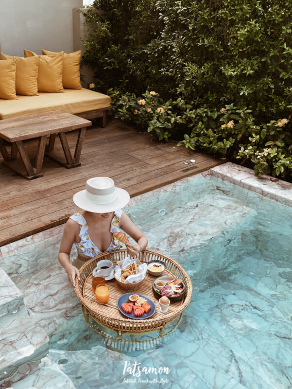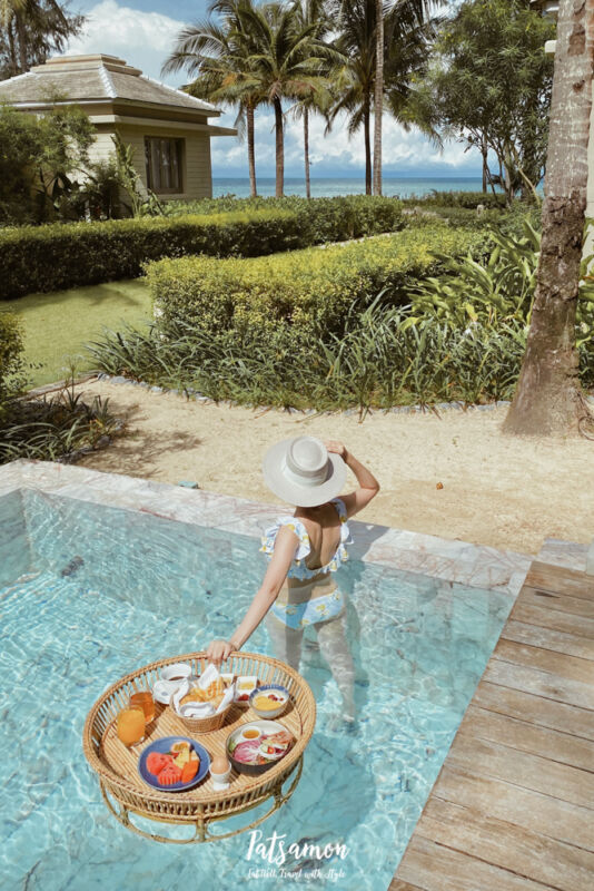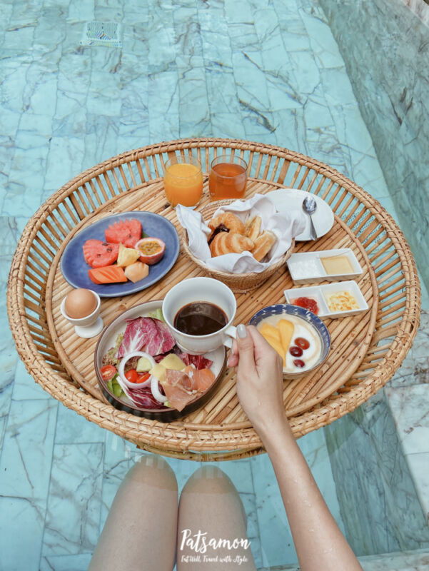 อาหารเช้าเราสามารถให้เค้ามาเสิร์ฟที่ห้องได้ด้วยนะคะ แล้วถ้าใครอยากได้แบบ floating breakfast มาถ่ายรูปชิค ๆ เก๋ ๆ ก็โทรบอกทางรีสอร์ทล่วงหน้า 1 วันค่ะเค้าก็จะมาเสิร์ฟให้ที่ห้องตามเวลาที่เรากำหนดค่ะ มี additional 500 บาทนะคะ ถ้าถามว่าแล้วได้ทานในน้ำมั้ยก็ตอบเลยว่าไม่ค่ะถ่ายรูปอย่างเดียวแล้วยกมาทานที่โต๊ะริมสระนั่นแหละ555