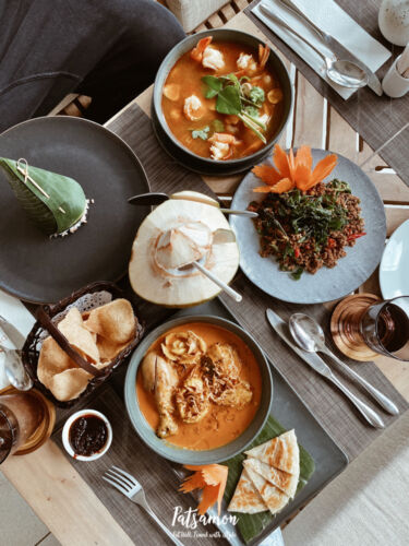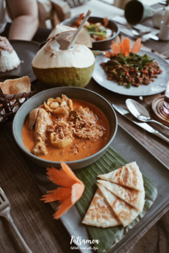 ทีนี่มีห้องอาหาร 2 ห้องค่ะ ห้องแรกคือ Takola เป็นห้องอาหารไทย (ตะโกลา เป็นชื่อเมืองที่นี่สมัยโบราณค่ะ) ทางรีสอร์ทบอกว่าเป็นอาหารไทยแบบ authentic แต่พรรษว่าบางเมนูรสชาติค่อนข้างฝรั่ง แต่โดยรวมรสชาติดีเลยค่ะ ที่ตรงนี้เป็นห้องอาหารเช้าด้วยนะคะ ตอนเช้าก็จะเป็น buffet มีอาหารเยอะทีเดียวค่ะ พรรษชอบที่มีอาหารพื้นเมืองเสิร์ฟตอนเช้าด้วยค่ะ วันที่พรรษไปมีขนมจีนแกงกะทิ กับขนมจีนแกงไตปลาค่ะรสชาติไทยแท้มากค่ะ เผ็ดสุด ๆ แต่อร่อยค่ะ